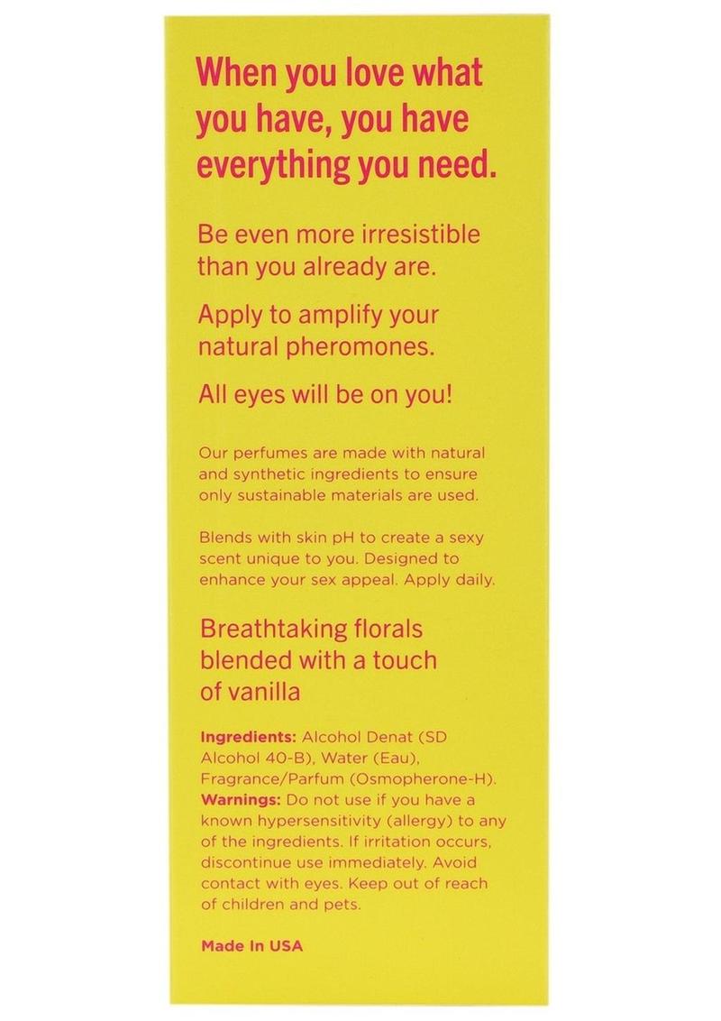 Breathtaking florals blended with a touch of vanilla. Top Notes: Fresh tropical mandarin and tangerine. Mid Notes: Spring rose, jasmin, gardenia, sweet apple and juicy pineapple. Bottom Notes: Patchouli, warm vanilla, sweet musk, tonka and creamy sandalwood. When you love what you have, you have everything you need. Be even more irresistible than you already are. Apply to amplify your natural pheromones. All eyes will be in you! Hold fragrance 5-7 inches away from skin and apply to pulse points. Blends with skin pH to create a sexy scent unique to you. Designed to enhance your sex appeal.